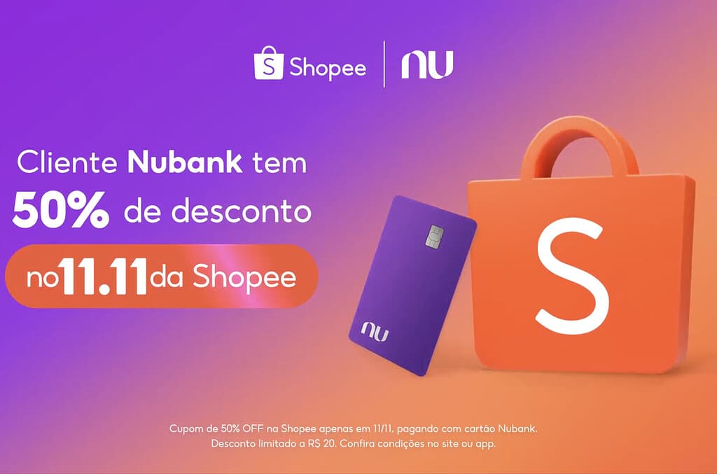 O 11 de novembro se tornou um marco nas datas promocionais da Shopee, superando, em muitos casos, até mesmo a Black Friday em volume de vendas. Em 2025, a marca inovou ao fechar uma parceria com uma das fintechs mais populares do Brasil. Entre os destaques, está o cupom de desconto de 50% para pagamentos com Nubank, limitado a R$ 20 por CPF, já disponível na carteira digital integrada do aplicativo da Shopee.