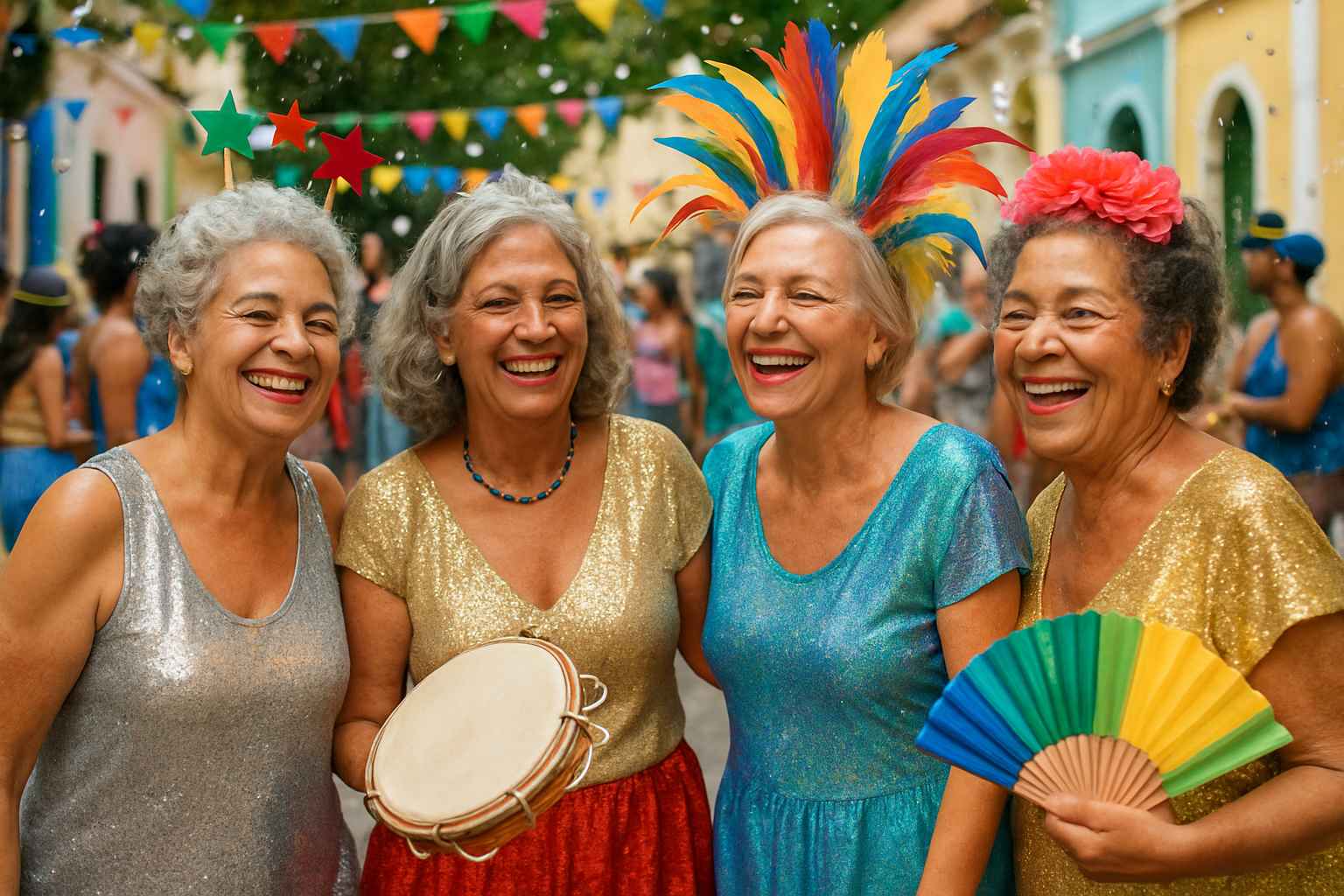 Máscaras, tiaras com penas, colares coloridos e chapéus de tecido transformam até as produções mais básicas. Aposte em peças fáceis de vestir e tirar, evitando acessórios pesados ou que prendam muito o movimento. No bloquinho 60+, a praticidade vira sinônimo de alegria.