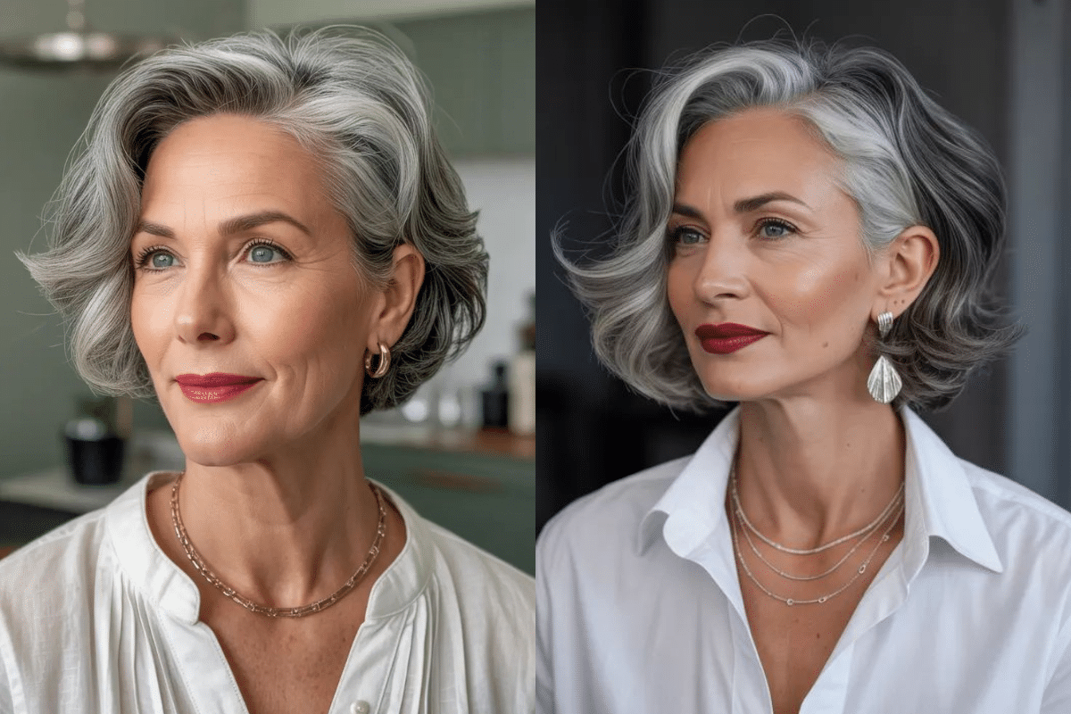 O french bob grisalho harmoniza bem com brincos de argola e roupas em tons neutros ou vibrantes, criando estilo marcante e elegante em qualquer ocasião. Experimente também acessórios de cabelo que ajudem a destacar o corte, especialmente em dias mais frios, e invista em maquiagens leves para realçar o ar parisiense sofisticado.