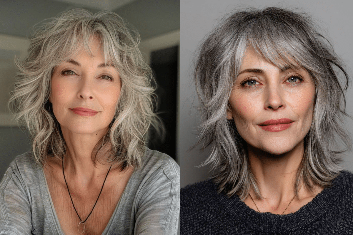 No universo dos cortes femininos, o shaggy se destacou por unir movimento e personalidade. Em cabelos grisalhos, sua estrutura em camadas irregulares faz com que diferentes tons — de brancos a prateados — se destaquem de forma natural, sem necessidade de tintura. O caimento propositalmente “bagunçado” realça a individualidade dos fios e cria uma aura jovem, sofisticada e autêntica.