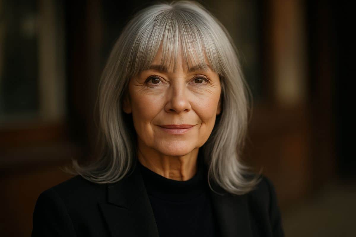 A franja reta também pode funcionar para mulheres 60+, desde que seja feita em versão mais leve e levemente desfiada nas pontas. Uma franja reta muito densa e pesada tende a criar um visual que pode endurecer os traços.