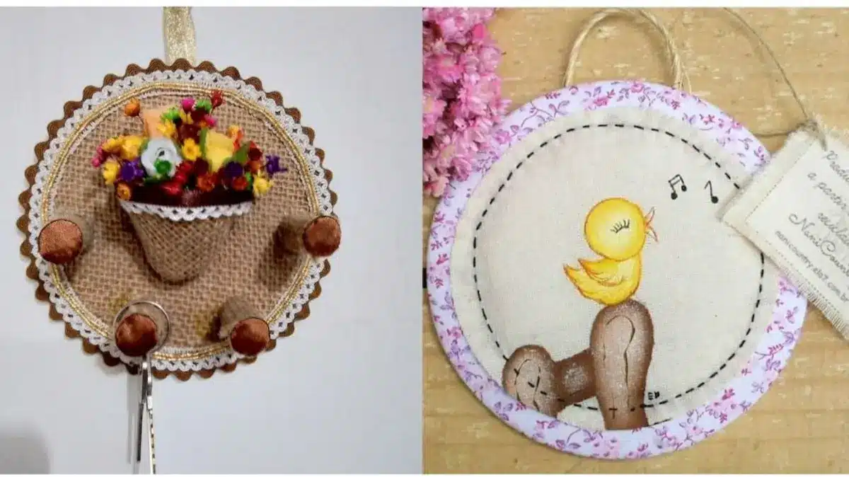- Para um organizador de objetos: Crie uma base de tecido mais firme e use acessórios como botões, rendas ou até espiral para pendurar pequenos objetos, como brincos ou chaves.