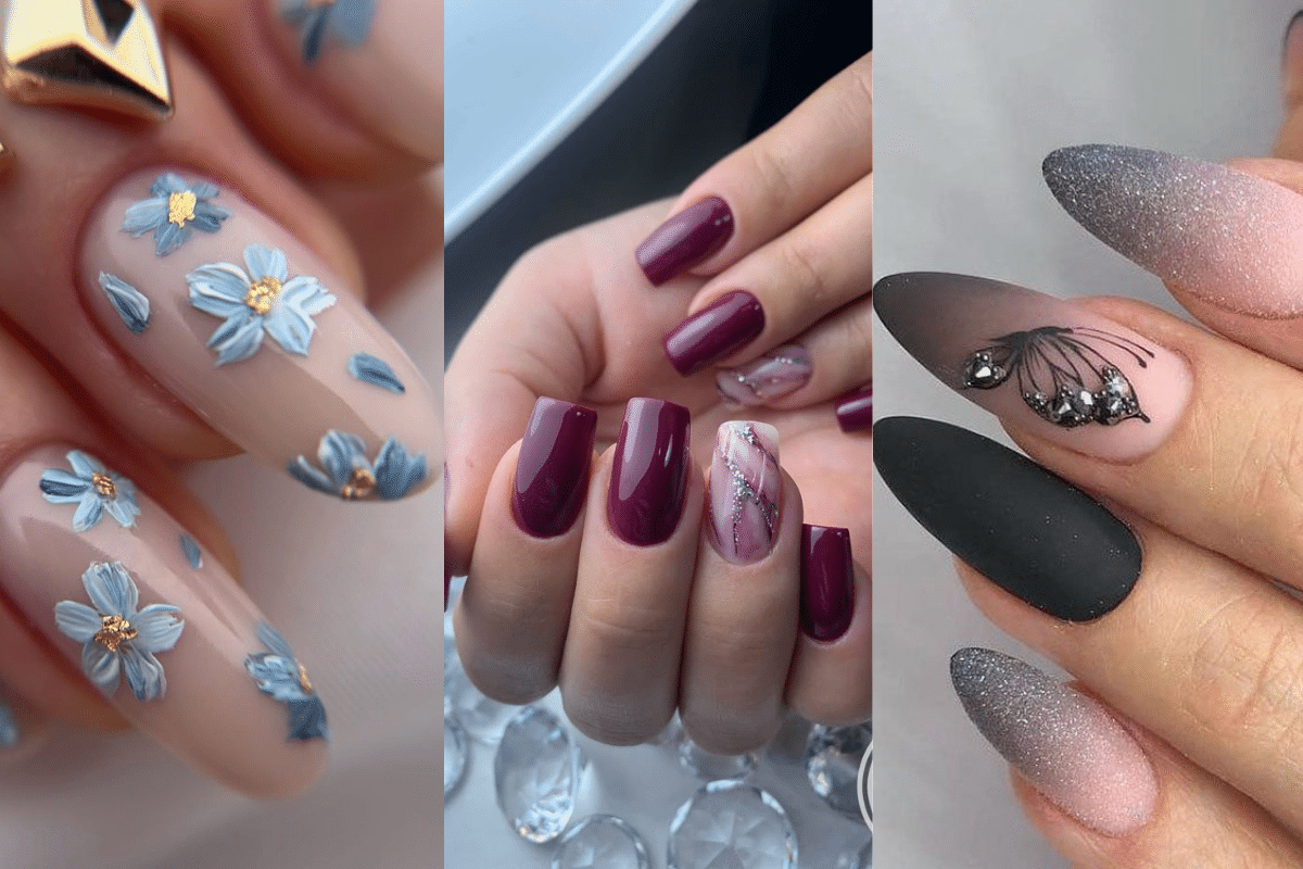 Os tons de azul são destaque para quem quer renovar sem radicalizar. Aposte no azul-céu com detalhes florais pintados à mão, criando sensação de leveza. Essa proposta combina com todos os tons de pele e pode ser adaptada com acabamentos glossy ou sóbrios.