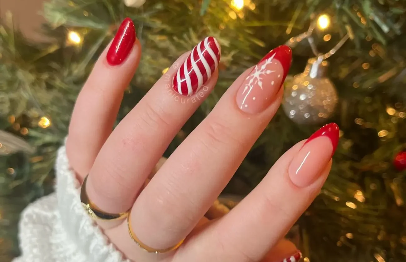 Em vez do desenho literal cobrindo toda a unha, a tendência é adotá-lo de forma mais sutil e moderna. Uma das abordagens mais populares é a “francesinha de gorro”, onde apenas a ponta da unha é pintada de vermelho, com uma fina linha branca texturizada ou com glitter simulando a base do gorro.