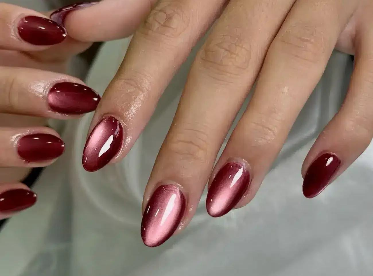 As “velvet nails” ou unhas de veludo recriam a aparência luxuosa e a textura macia do tecido. Este efeito é geralmente alcançado com esmaltes magnéticos que, quando expostos a um ímã, alinham as partículas de brilho de uma forma específica, criando uma ilusão de profundidade e um reflexo difuso que imita o veludo. O resultado é uma unha com um brilho multidimensional que muda conforme a incidência da luz, proporcionando um acabamento elegante e diferenciado.